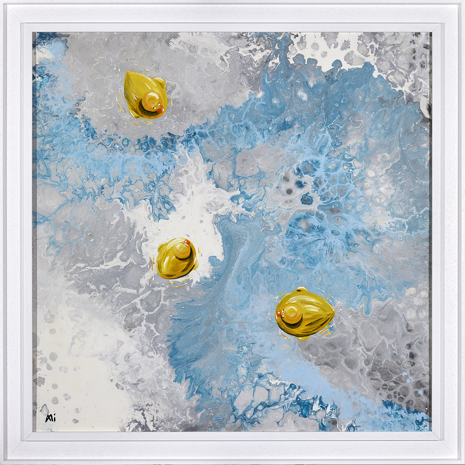 Liquid pour painting on MDF with three happy playful bath ducks painted on top of the liquid pour and varnished. The large original painting available, 60cm × 60cm. Giclee prints available at 40cm × 40cm to fit 50cm × 50cm frame.