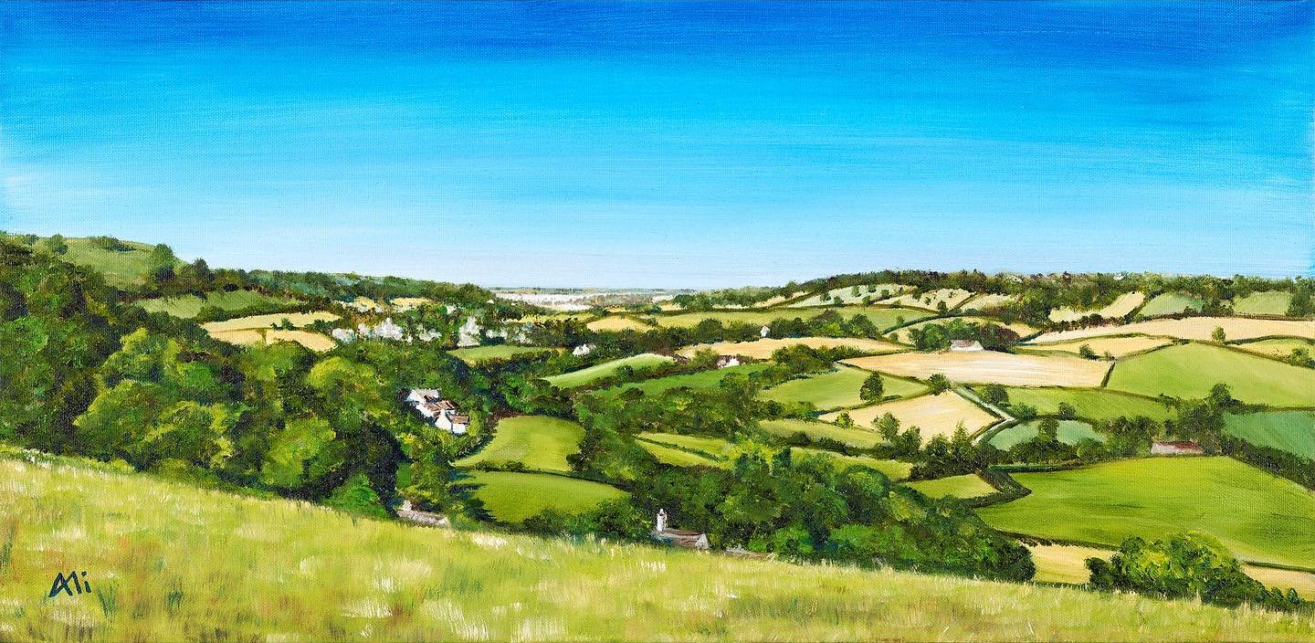 This 60x30cm deep edge canvas it as oil painting of Box Valley. The iconic view across the valley towards Bath is loved and enjoyed by many a local and tourist.