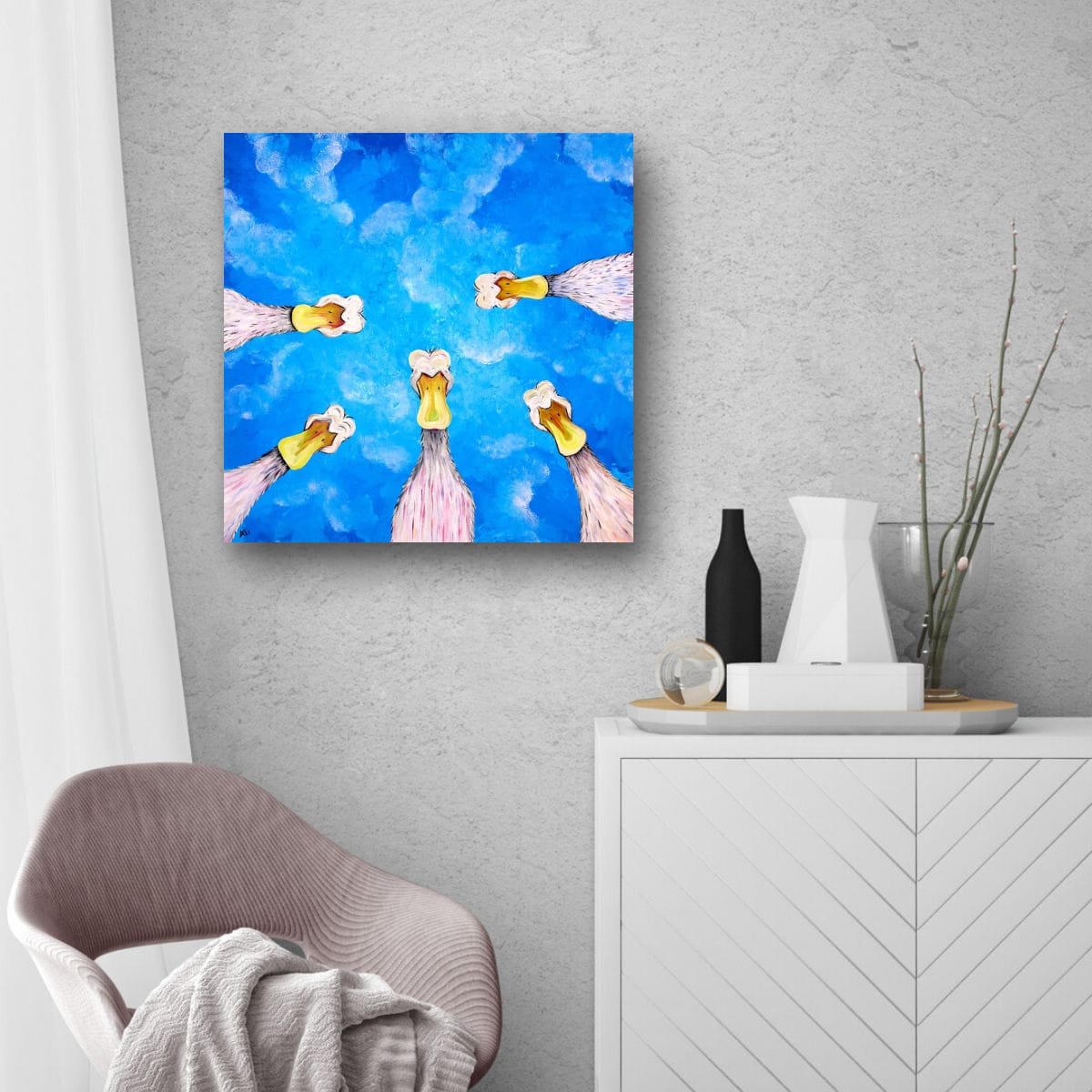 Bring a burst of personality and playful charm to your space with “Gossip Girls”—a whimsical original painting featuring five delightfully expressive ducks. Gathered under a brilliant blue sky, these feathered friends appear to be caught mid-conversation, their quirky crests and curious beaks angled toward the viewer as if sharing the latest news from the pond.