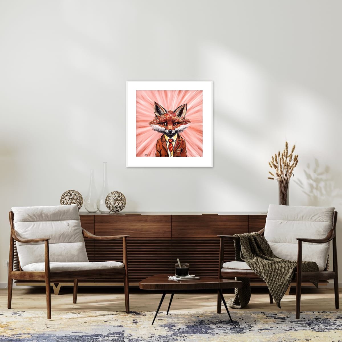Mr Fox – This whimsical portrait presents a fox dressed in a tailored brown suit, complete with a crisp white shirt and a vibrant red and yellow tie. The fox’s expressive eyes and detailed fur create a striking contrast against the soft copper background, which radiates a playful energy. The stylised approach adds a creative flair, inviting viewers to appreciate the charm and character of this unique piece. Perfect for adding a touch of personality to any space, this artwork is sure to spark conversation and delight.