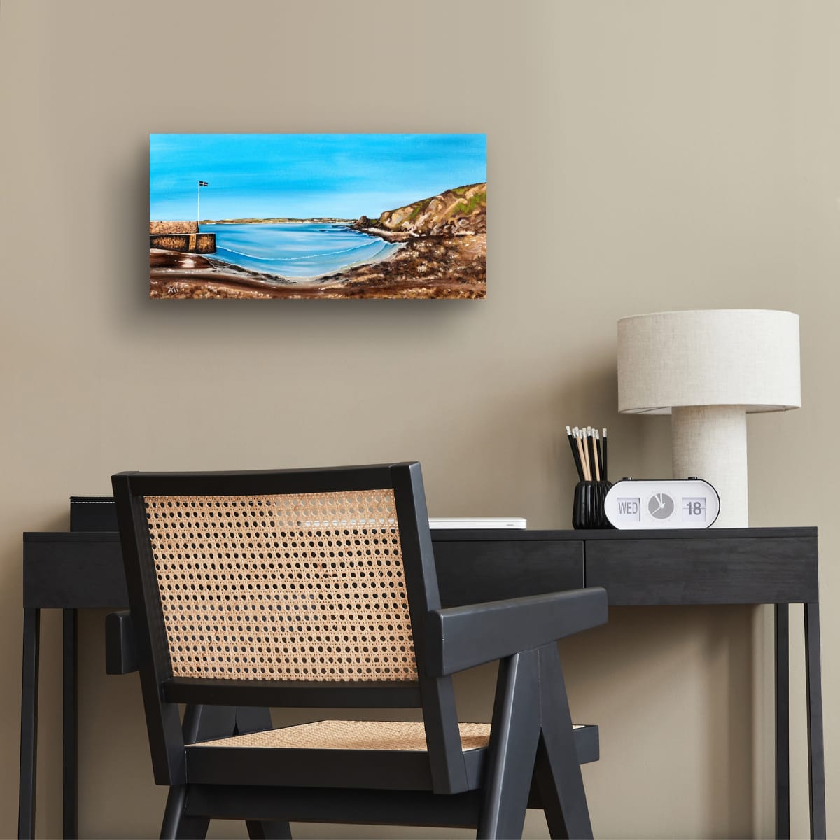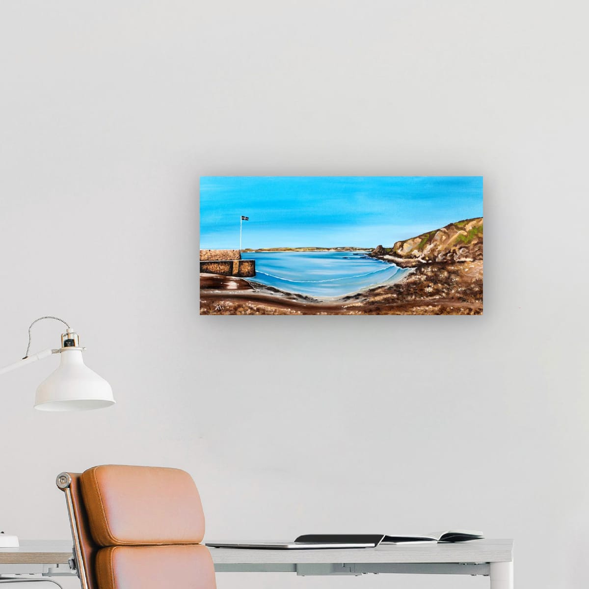 This 60x30cm deep edge canvas it an oil painting of Polkerris (Cornwall) and a view over to Par and St Austell. A beautifully calm beach, one sheltered by its harbour wall in the vast St Austell Bay. This was our go to beach with the kids when tiny. Beach shop and facilities on hand, even a pub and restaurant if the weather turned bad. A great place for beach combing and almost my entire sea glass collection has come from this sand.