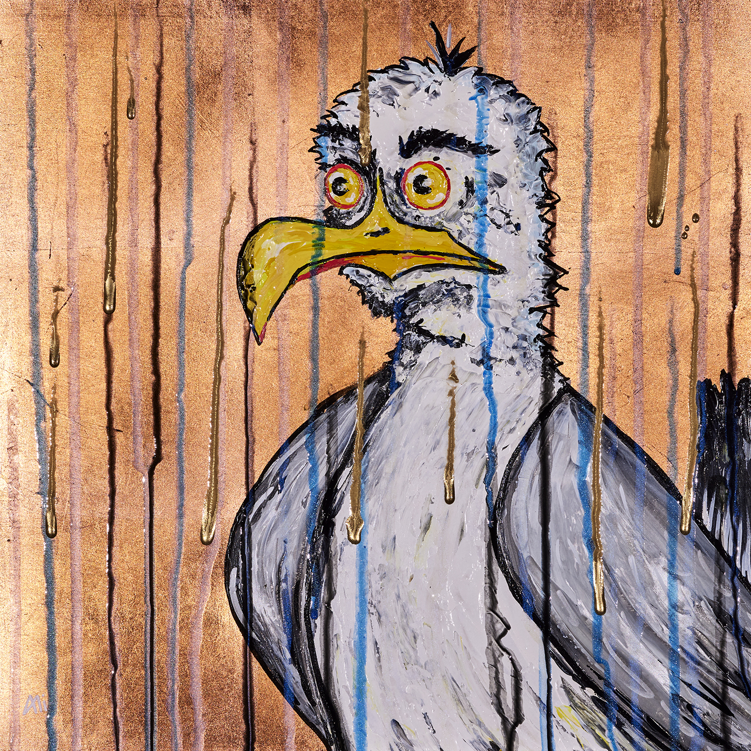 A cheeky Seagull, on rose gold leaf backed MDF, painted in acrylics and dripped with resin for the rain. This Acrylic painting is on a 40x40cm board and framed. A edition run of just 50 Giclees are available printed to size.
