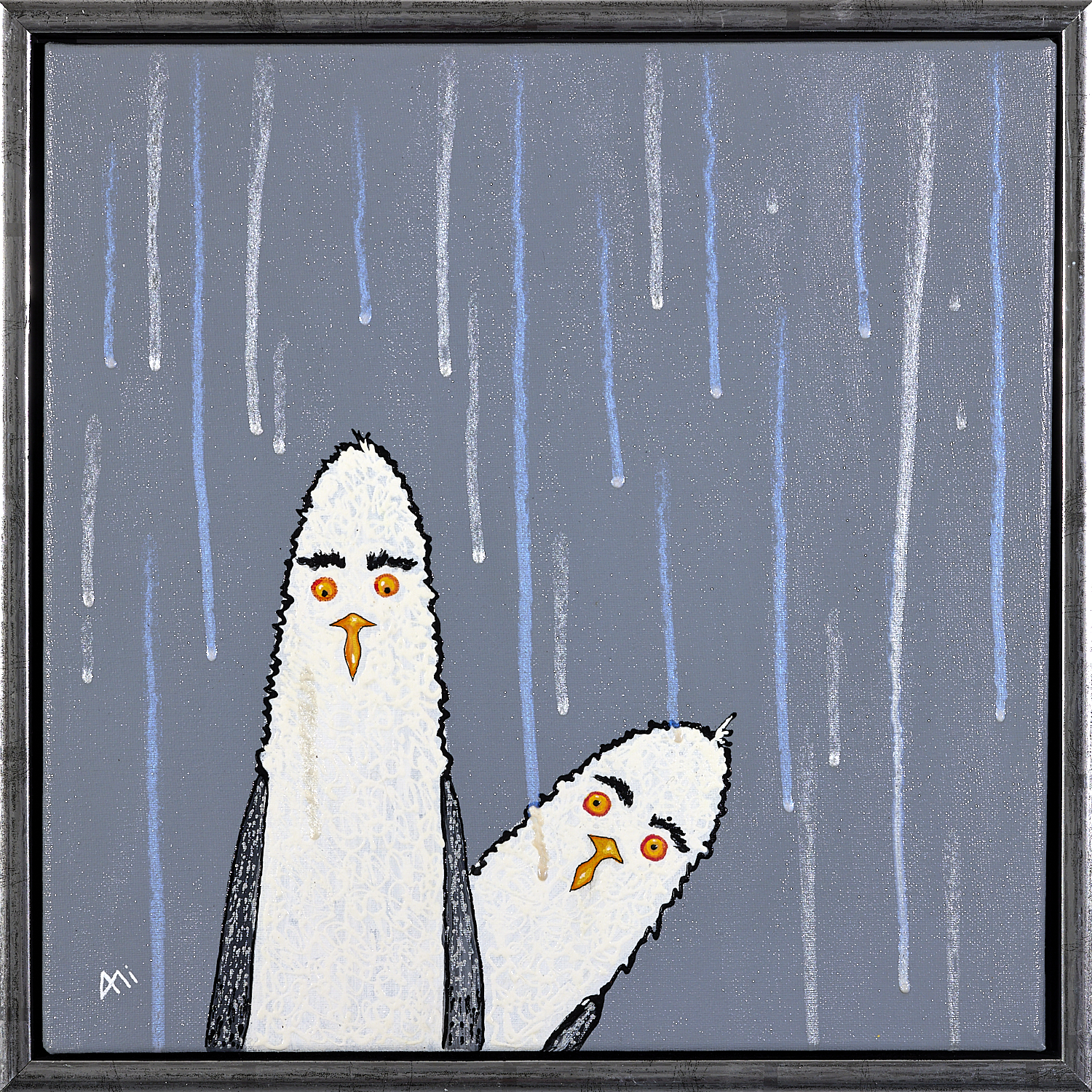 Tom and Tan in the rain. Acrylic painting on grey background on MDF with rain drip effect and small impasto gel medium in the acrylic paint. The original painting is available (40cm × 40cm) in floating silver frame. No prints.